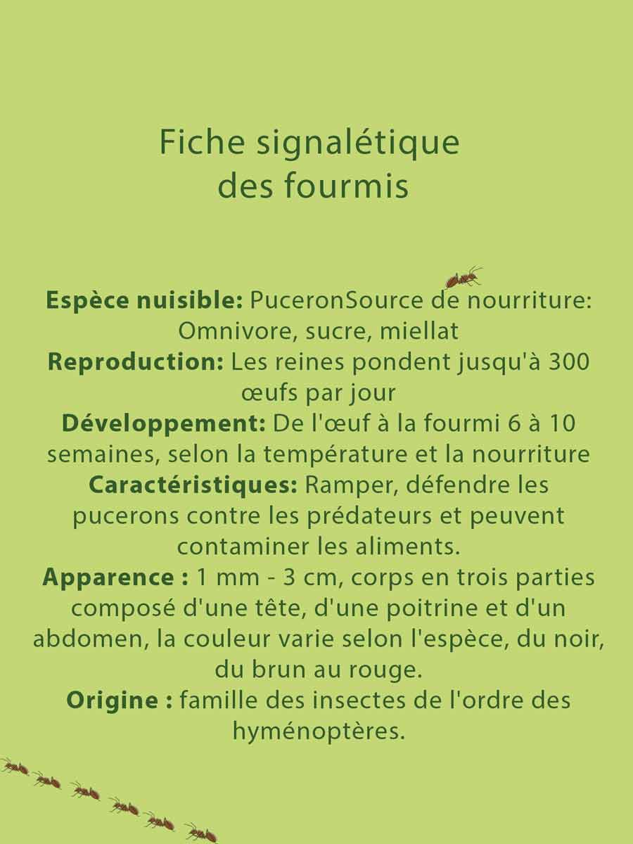 La taille et le poids varient d'une espèce à l'autre. En moyenne, les fourmis mesurent entre 0,8 et 25 millimètres de long et pèsent environ six à dix milligrammes. Les fourmis vivent souvent à l'extérieur, mais peuvent également être présentes à l'intérieur. Pour garantir un contrôle efficace et à long terme, il faut lutter contre l'infestation à l'intérieur et à l'extérieur. Les nids de fourmis peuvent hiberner jusqu'à douze ans.