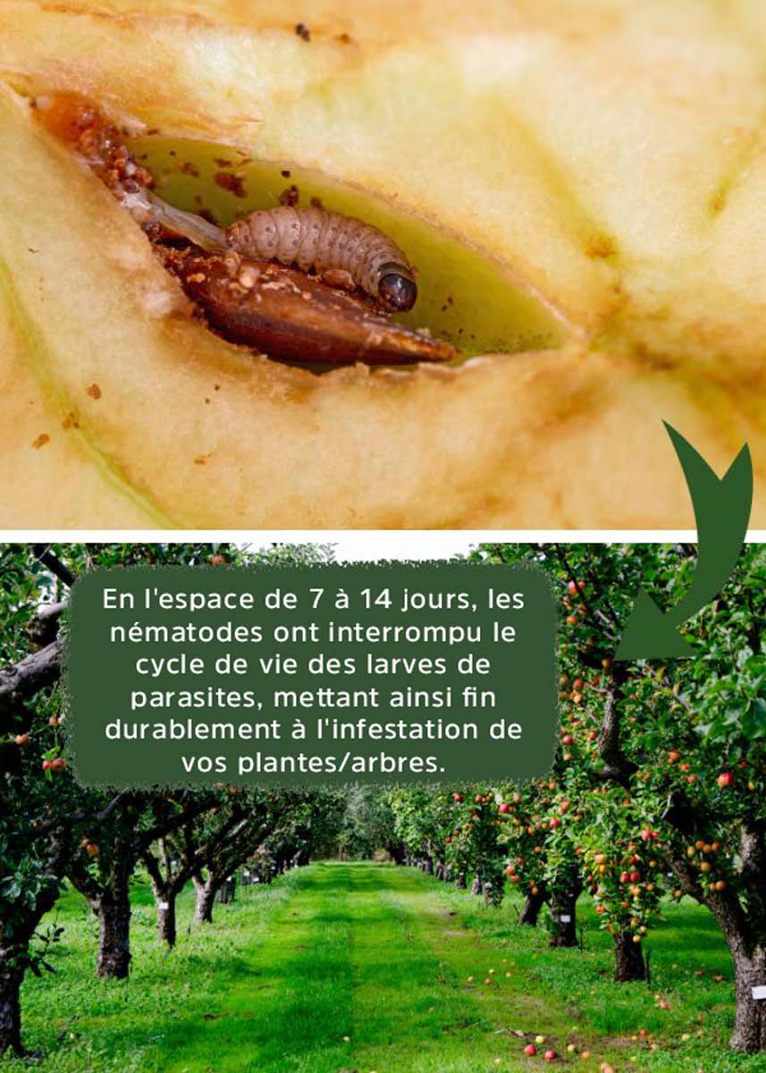 ✓ Pas de développement de résistance: Contrairement aux produits chimiques utilisés pour lutter contre les larves de carpocapse, les carpocapses ne peuvent pas devenir résistants aux nématodes.