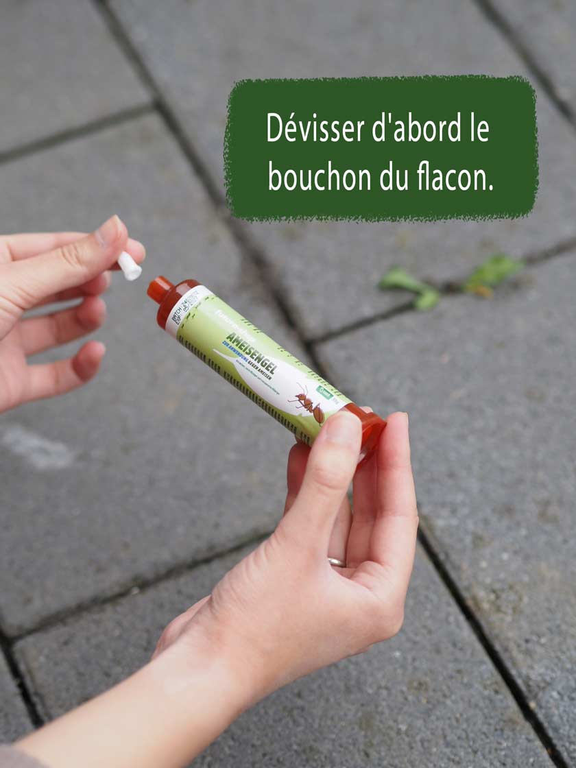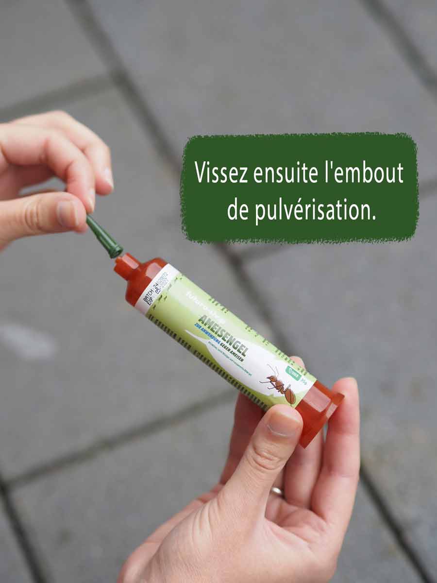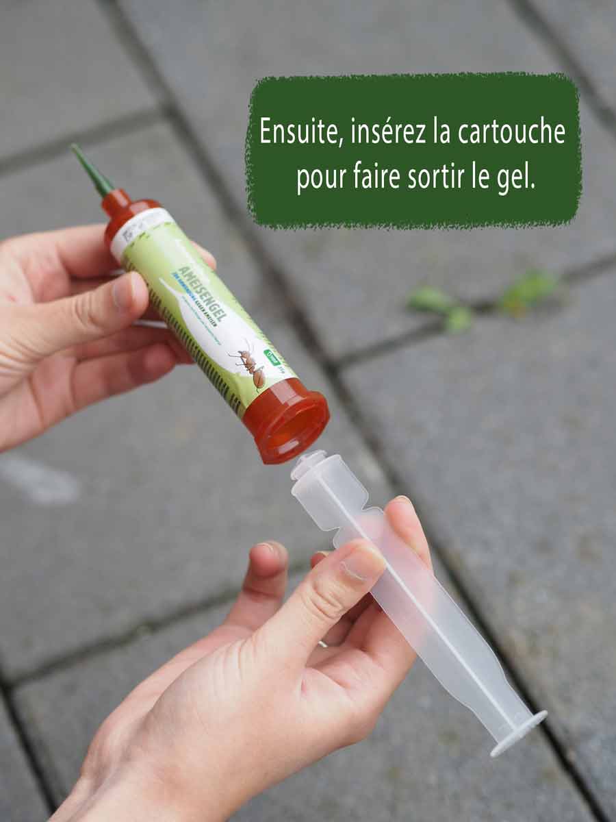 Retirez le couvercle de la cartouche et vissez l'embout fourni. Cela permet un épandage ciblé du gel appât fourmis. Pressez le gel appât hors de la cartouche à l'aide de l'applicateur et appliquez le gel sur les zones concernées. Un succès rapide ne peut être garanti que si le gel est appliqué à proximité des fourmis. La quantité optimale à appliquer dépend de l'ampleur de l'infestation. Plus l'infestation de fourmis est importante, plus la quantité de gel appât fourmis appliquée doit être élevée.