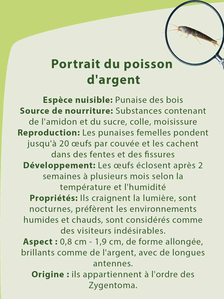 Les poissons d'argent sont les représentants les plus courants du groupe et ont une peau argentée et brillante, semblable à des écailles. Ils mesurent généralement environ 1 à 2 cm de long et préfèrent les environnements humides et sombres comme les salles de bain, les caves et les cuisines. Les poissons d'argent aiment les endroits chauds et humides, avec un taux d'humidité optimal de 75 à 90 % et une température de 20 à 30 degrés Celsius. Ils sont nocturnes, craignent la lumière et se cachent pendant la journée dans les joints et les fissures sombres, derrière les plinthes ou les tapisseries décollées. Les poissons d'argent se nourrissent d'aliments à base de sucre et d'amidon, ainsi que de cheveux, de squames de peau, de poussière de maison, de coton, de lin et même de moisissures. En raison de leur caractère omnivore et de leur capacité à survivre plusieurs mois sans nourriture, ils sont extrêmement adaptables. Cependant, contrairement aux poissons-papier et aux poissons-poêles, les poissons d'argent ne causent pas de dommages graves et sont en principe inoffensifs pour l'homme. Néanmoins, ces petits insectes agiles et bruyants ne sont pas très agréables lorsqu'ils se promènent régulièrement sur le sol.
