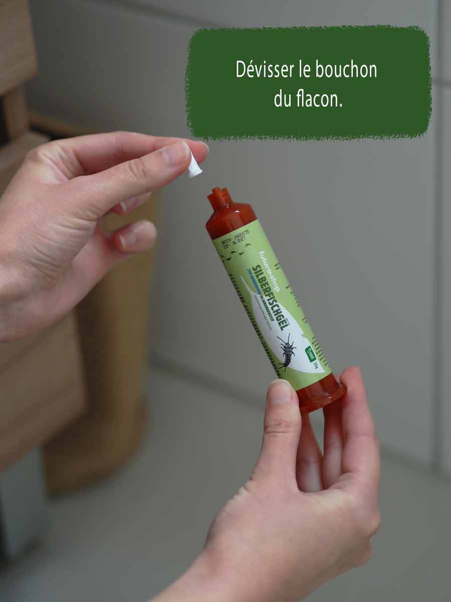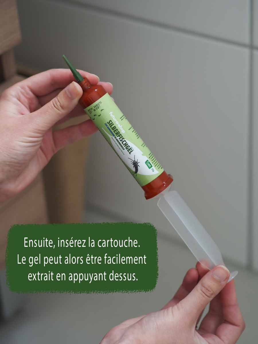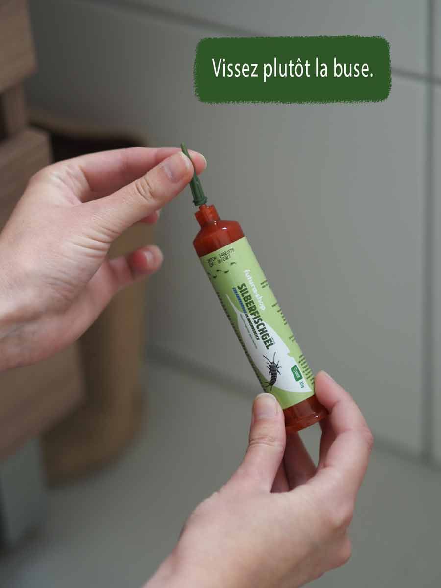 Dans un premier temps, vous devez identifier les trajets typiques des poissons d'argent. Les petits poissons se déplacent de préférence le long des plinthes, dans les fissures et les joints, ainsi que dans les zones humides et sombres comme les salles de bain et les caves. Les chemins typiques peuvent également être les endroits où vous les avez déjà vus. Une fois que les cachettes potentielles ont été trouvées, le gel peut être appliqué de manière ciblée à l'aide de la seringue fournie. Appliquez-le en petites gouttes ou en fines bandes directement sur les voies de passage des poissons d'argent et dans les fissures et les joints. Il est important de placer le gel à plusieurs endroits afin d'assurer une couverture maximale. De cette manière, vous augmentez l'efficacité et rendez plus facile pour les hôtes indésirables de sentir le gel pour poissons d'argent.