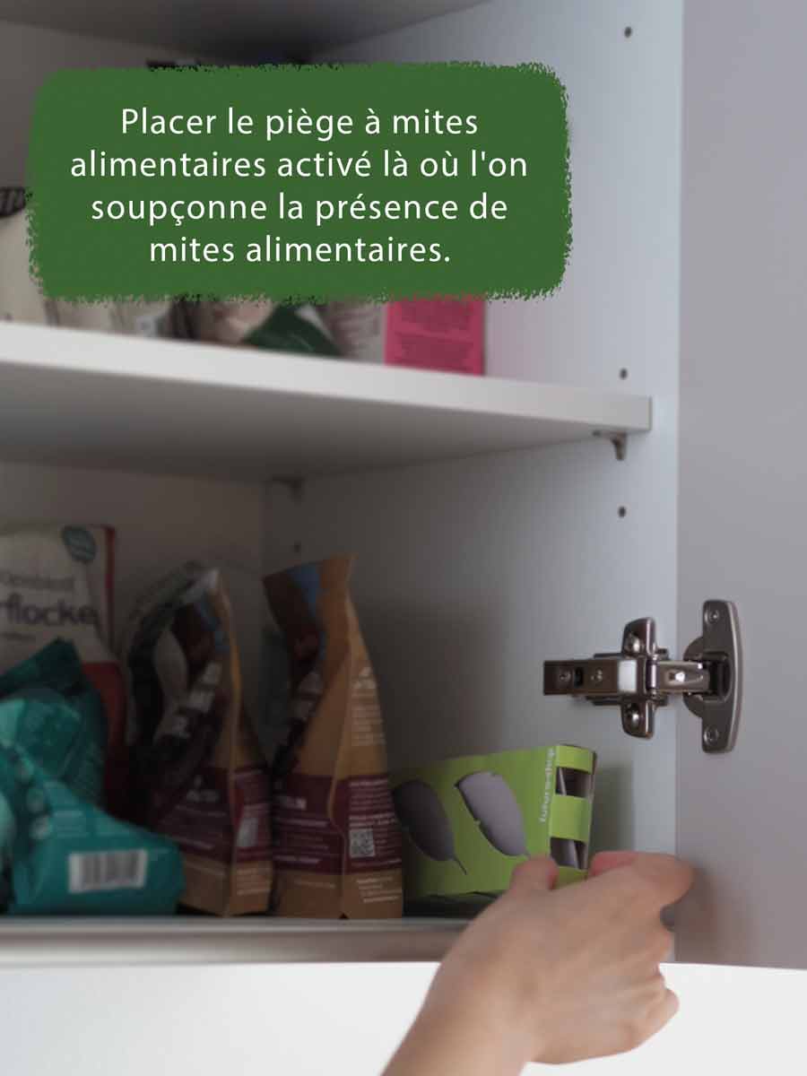 En règle générale, un piège devrait être installé par garde-manger. En fonction de la taille de votre cuisine, vous devriez toujours placer 1 ou 2 pièges pour capturer efficacement les mites alimentaires.