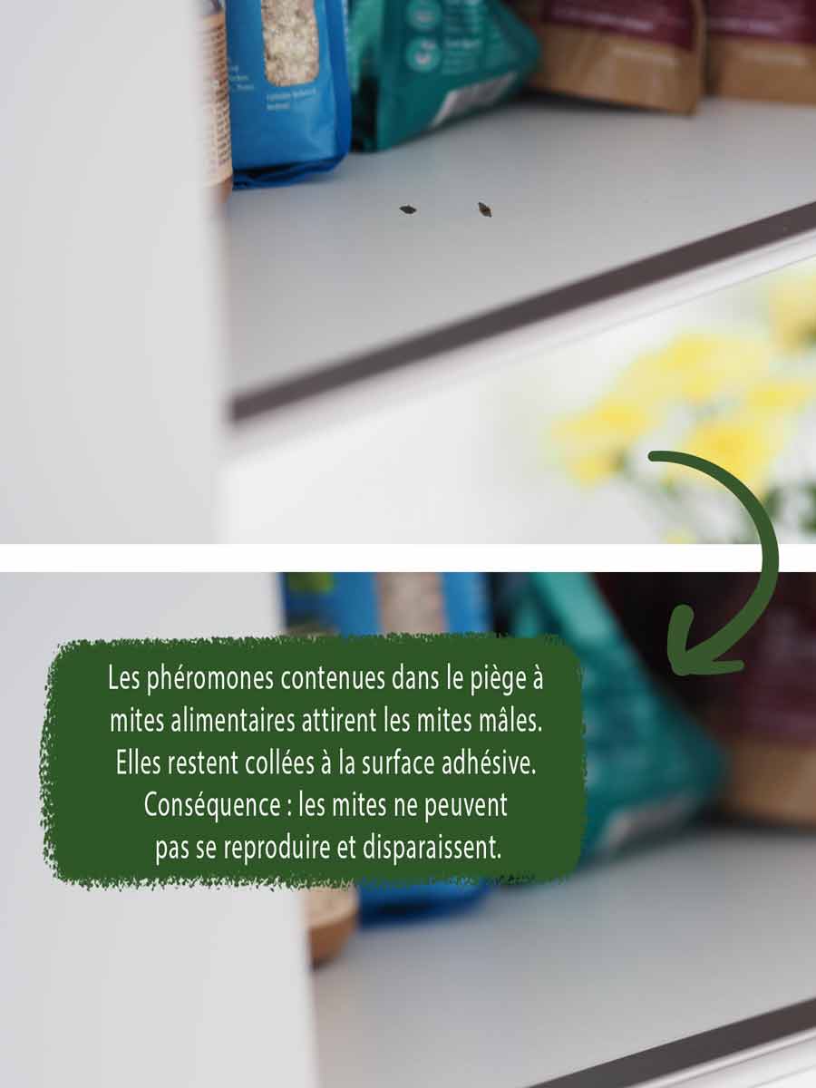 On appelle piège à phéromones tous les pièges qui attirent leurs animaux cibles (dans ce cas, les mites de la farine) avec des phéromones, c'est-à-dire des substances odorantes. Les phéromones sont sécrétées par la peau des insectes, mais aussi des vertébrés et même des humains. Elles jouent un rôle important dans le comportement sexuel et attirent les partenaires sexuels. Dans ce cas, les phéromones sont reproduites chimiquement pour attirer les mites alimentaires dans le piège collant, où elles restent collées et meurent.