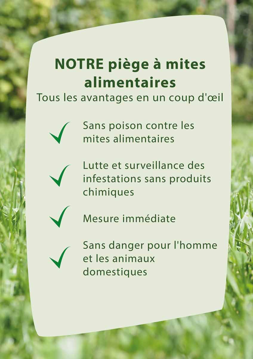 La substance active du piège à mites alimentaires est une reproduction de l'attractif sexuel (phéromone) des mites femelles. Cette substance est déjà intégrée dans la surface adhésive du piège et s'active dès que le film de protection est retiré. L'activation attire alors les mites mâles qui restent collées sur la feuille adhésive du piège à mites alimentaires. Cela empêche la reproduction et réduit continuellement la population de mites. Ce piège est un véritable classique parmi les pièges à mites. Il existe depuis des années et a déjà fait ses preuves des millions de fois dans de nombreux foyers.
