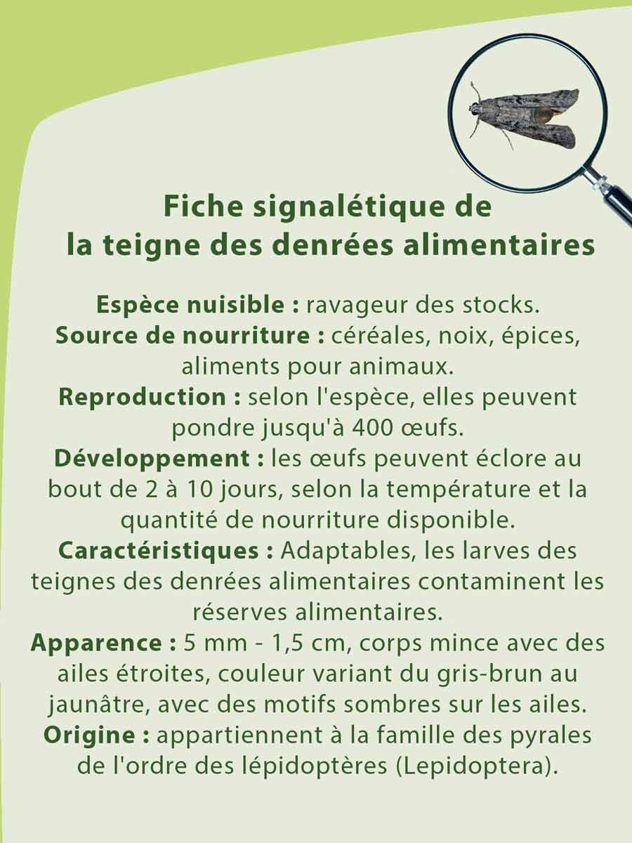 Il existe différents types de mites alimentaires. Cependant, les mites de la farine et des fruits secs sont les plus courantes. La pyrale de la farine est gris argenté, mesure environ 14 mm et cet insecte est originaire d'Inde. On la trouve partout où l'on travaille avec des céréales, des produits céréaliers et de la farine. La teigne des fruits secs a un aspect brun-blanc, ne mesure que 10 mm et est originaire du bassin méditerranéen et du Proche-Orient. On les trouve non seulement chez les particuliers, mais aussi dans les grands magasins. Le développement des deux espèces se comporte de manière identique. La femelle pond jusqu'à 300 œufs, un par un, sur le substrat (ici, le matériau dans lequel vit le papillon de nuit). Après environ 20 jours, le développement larvaire est terminé et la larve quitte le lieu de ponte. Elle se nymphose ensuite dans un endroit protégé, où elle éclot au bout de 2 à 3 semaines. La nocivité des mites se manifeste par la contamination des marchandises avec des fils de soie collants et des excréments. Les aliments infestés doivent donc être retirés immédiatement. Les mites alimentaires sont généralement combattues à l'aide de pièges à mites alimentaires ou de guêpes parasites.