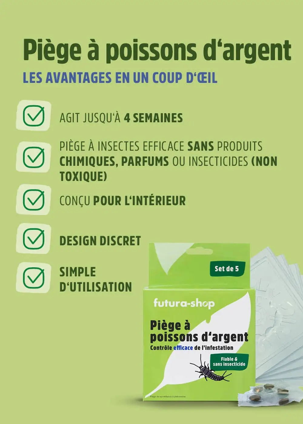 ✓ Le piège à poissons d'argent est un piège à insectes écologique et efficace qui ne contient ni produits chimiques, ni parfums, ni insecticides (non toxiques). Il convient pour les habitations et est totalement inoffensif pour les personnes et les animaux domestiques.