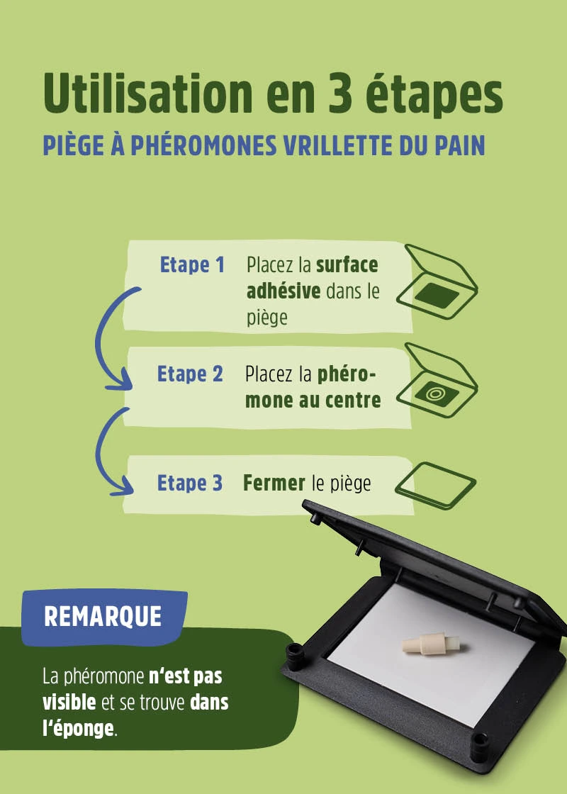 Dans le paquet, vous trouverez le piège à phéromone en plastique qui s'ouvre, 3 plaquettes adhésives et la phéromone spéciale. Ouvrez le piège à charançon du pain. Si vous remarquez de la poussière ou des saletés dues au transport, retirez-les. Enfilez des gants (si vous en avez). Prenez l'une des plaquettes adhésives dans votre main et retirez le film protecteur marron. Placez la plaquette avec la surface adhésive vers le haut sur la moitié inférieure du piège à insectes. Il y a à l'intérieur un support supplémentaire qui assure une résistance optimale. Ouvrez le petit emballage dans lequel se trouve l'attractif. Il est entouré d'une enveloppe supplémentaire que vous n'avez pas besoin d'ouvrir - il vous suffit de retirer le film plastique. Fixez la phéromone sur la surface adhésive dans le piège en plastique. Fermez maintenant le piège à phéromone et placez-le dans la zone où vous voulez combattre les charançons du pain. A partir de maintenant, l'attractif agit pendant environ 2 mois. Contrôlez régulièrement la surface adhésive. Dès qu'elle n'est plus collante ou qu'elle est déjà recouverte de charançons du pain, remplacez-la par une nouvelle plaquette adhésive. Si vous n'utilisez pas de gants, veillez à vous laver les mains après avoir installé le piège à charançons du pain !