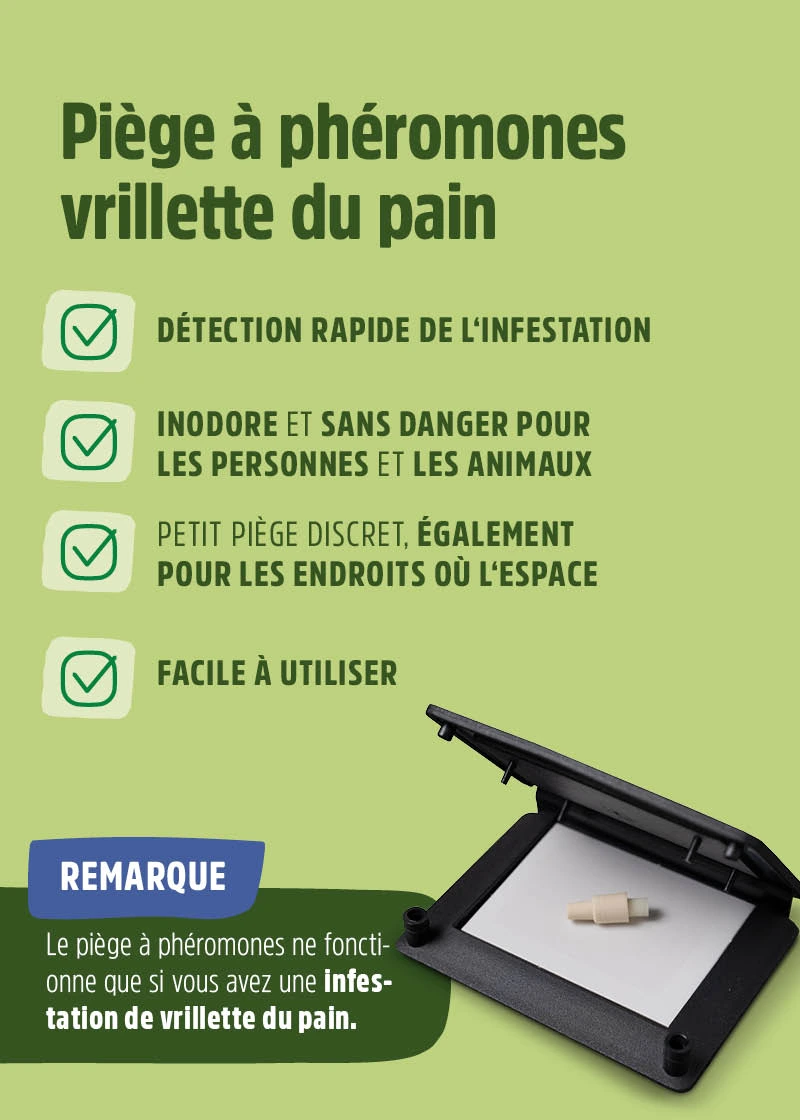 Un piège à charançon du pain permet de détecter la présence ou l'absence d'une infestation de charançons du pain (Stegobium paniceum). Le piège peut être placé dans différentes pièces où l'infestation est suspectée et où vous souhaitez lutter contre les charançons du pain. Le piège à charançon du pain agit de manière très spécifique et attire uniquement les adultes mâles. Pour obtenir le meilleur effet possible avec un piège à charançon du pain, nous recommandons de placer un piège tous les 10 mètres. Il est également possible de placer plusieurs pièges à charançon du pain dans une même pièce. La phéromone est inodore pour l'homme. Elle n'est perçue que par les adultes mâles, car il s'agit d'un attractif sexuel. Nous vous recommandons d'utiliser les pièges à phéromones pour détecter une infestation avant ou après un traitement.
